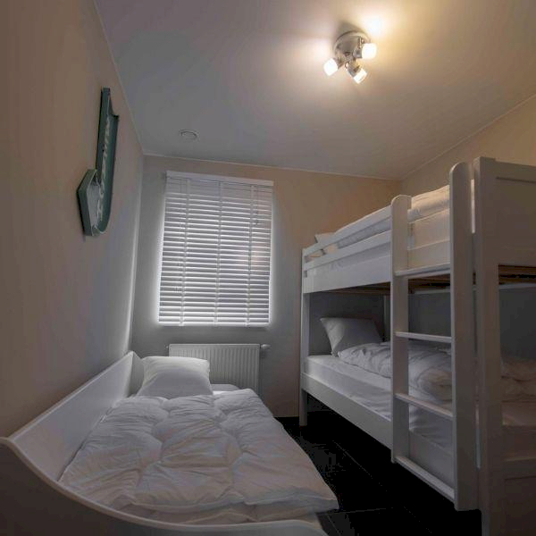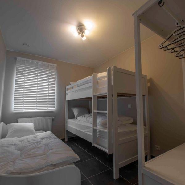• Kamer 2 is voorzien van een stapelbed (90 cm x 2m) en een extra singlebed. Per bed is een dekbed en een kussen